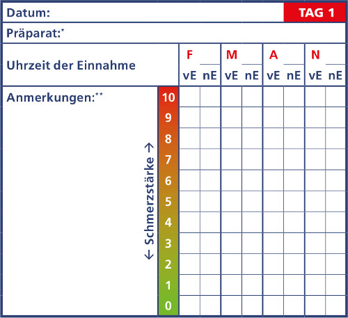 Sie sollten also Ihr Schmerztagebuch konsequent – mindestens einmal täglich – führen. Nur durch eine lückenlose Dokumentation können Sie und Ihre Ärztin/Ihr Arzt Ihren Gesundheitszustand und die Wirksamkeit der Therapie richtig beurteilen.